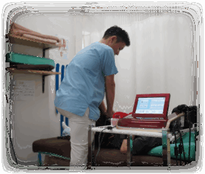 高電圧の電気刺激を用いて、痛みの原因を「検査」し「施術」する治療法です。